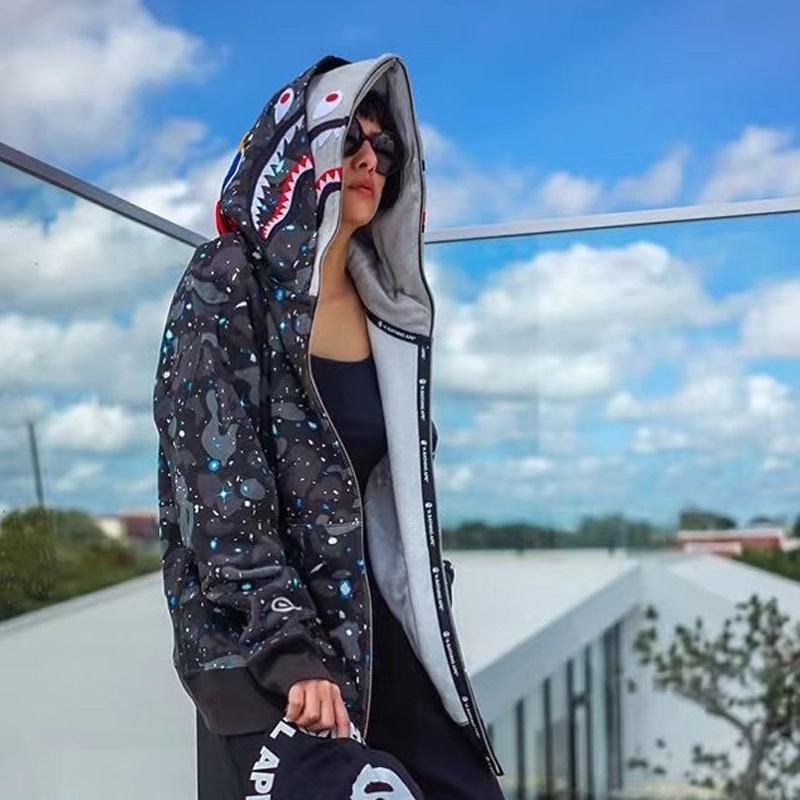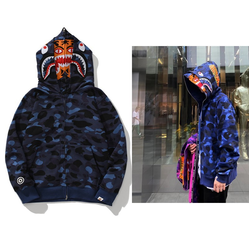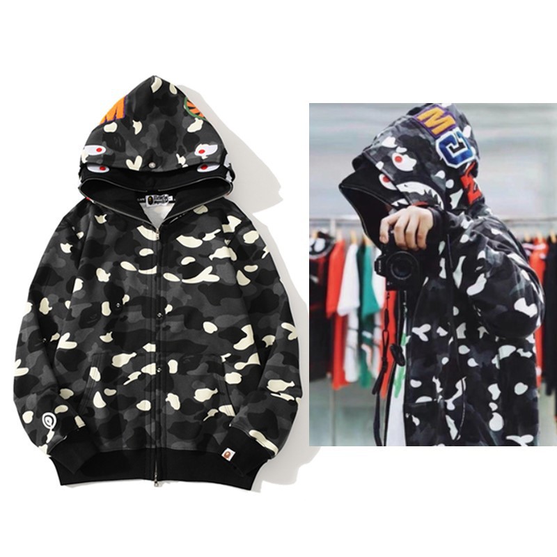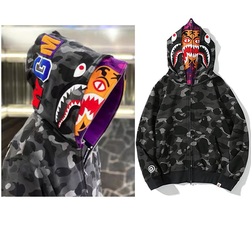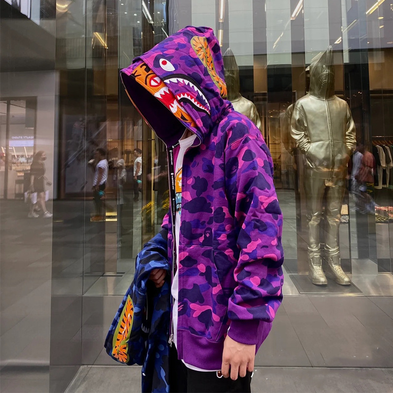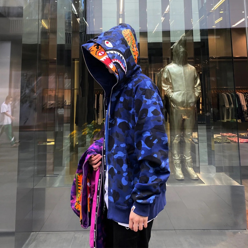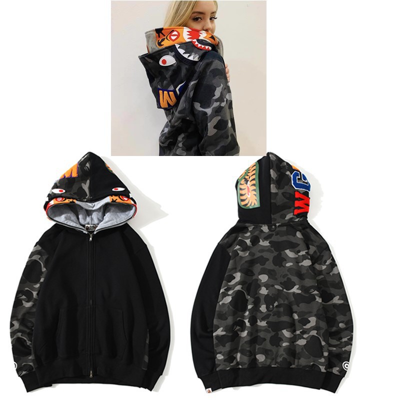 猿人APE サメと虎の頭刺繍入り迷彩柄ダブルハットスウェットシャツ メンズ ゆったりカーディガン ジップアップフード付きジャケット 夜光