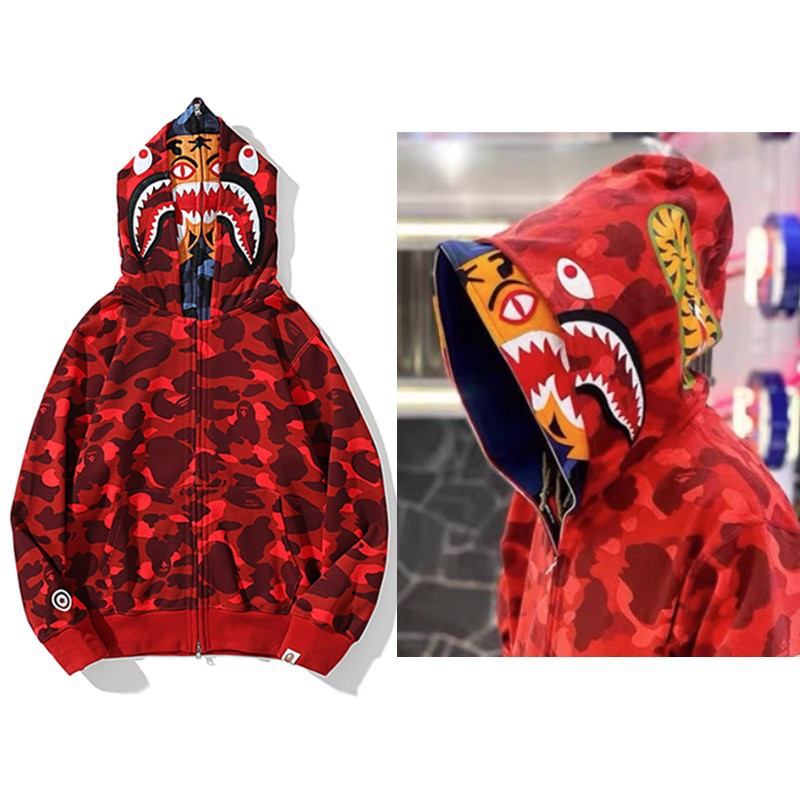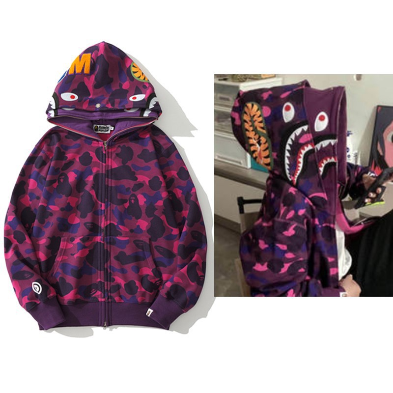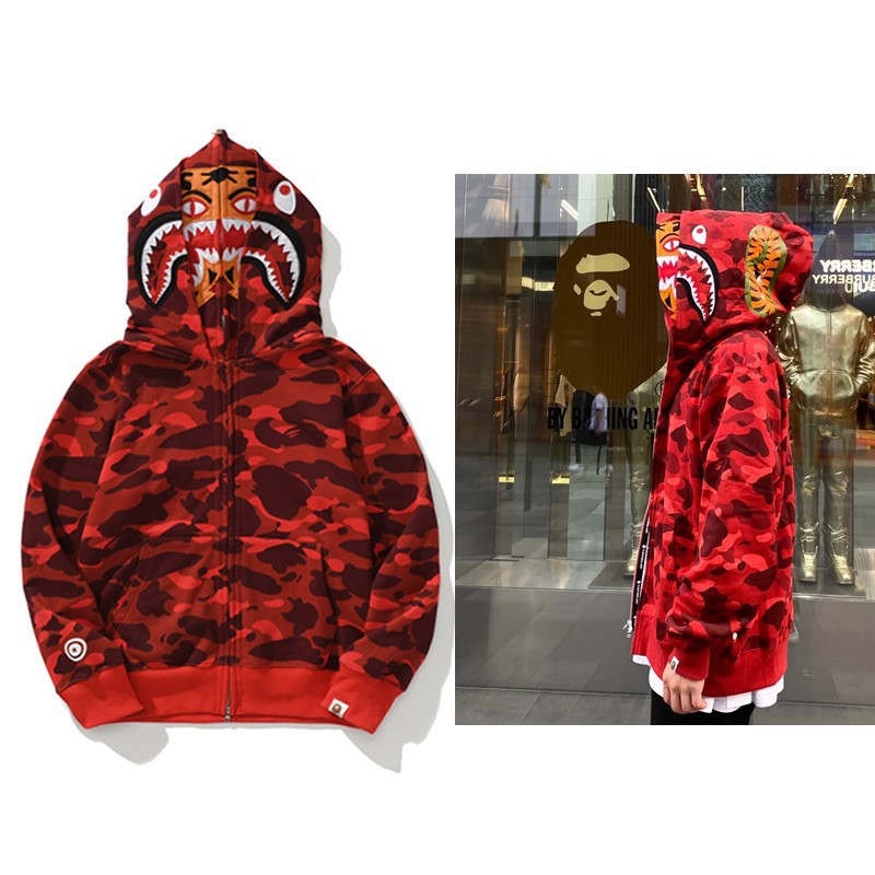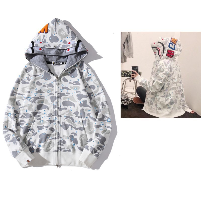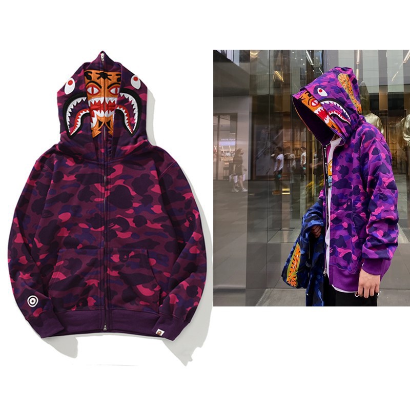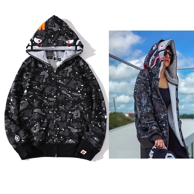 猿人APE サメと虎の頭刺繍入り迷彩柄ダブルハットスウェットシャツ メンズ ゆったりカーディガン ジップアップフード付きジャケット 夜光