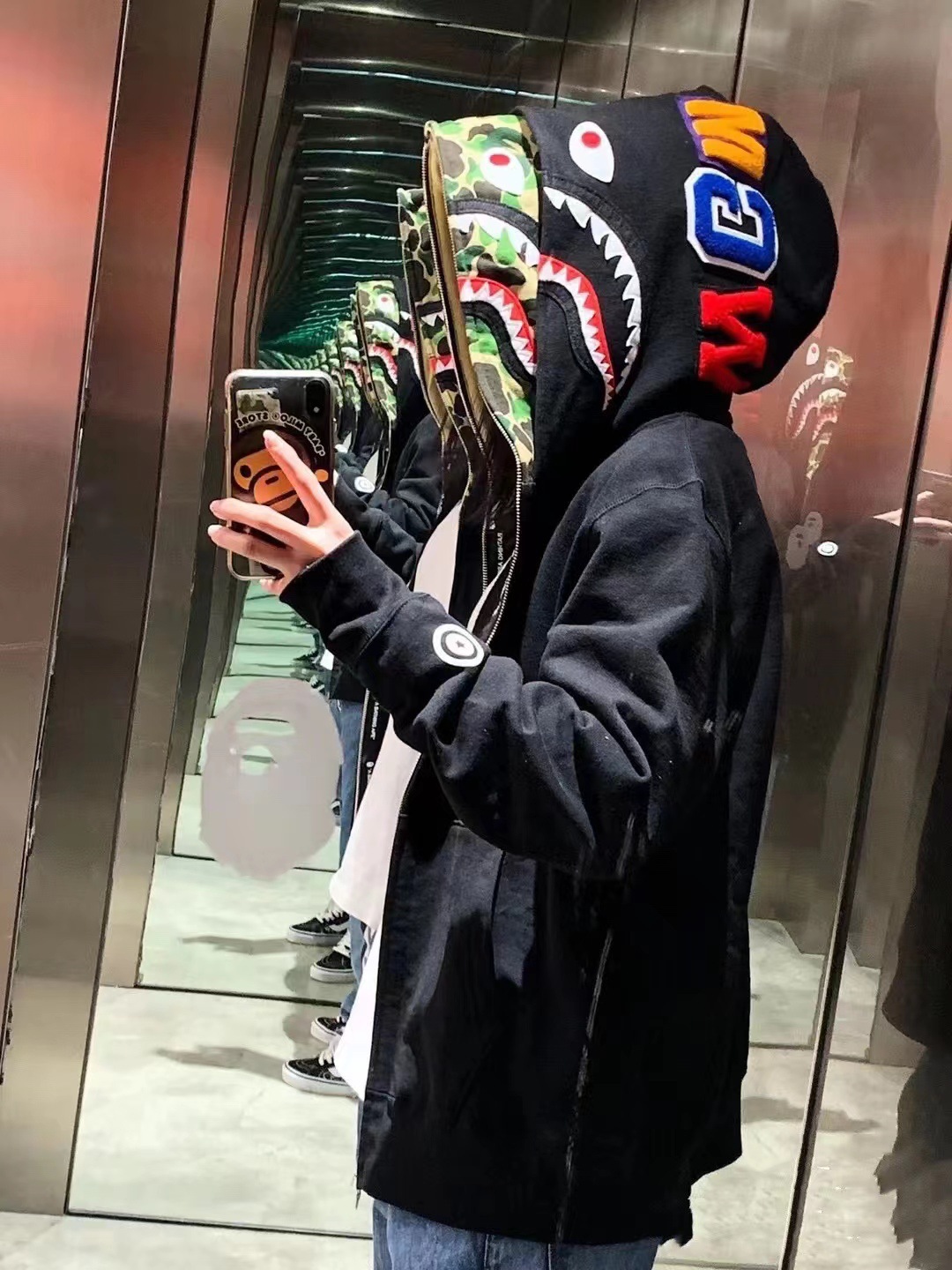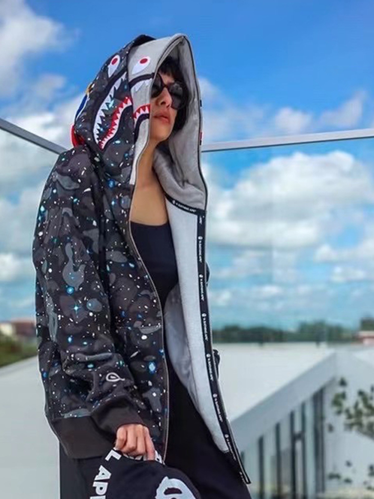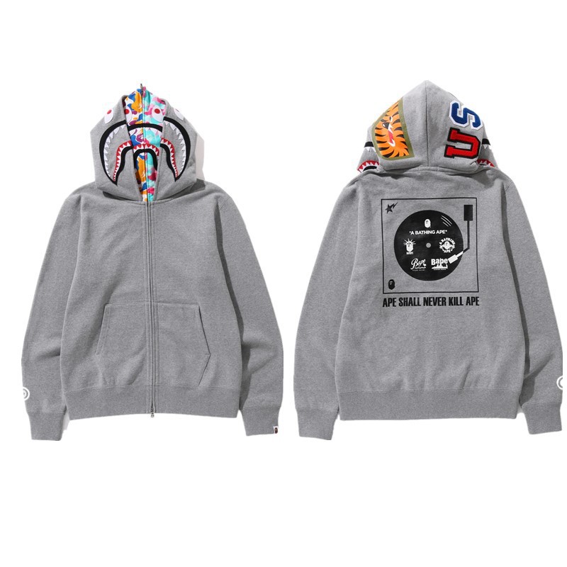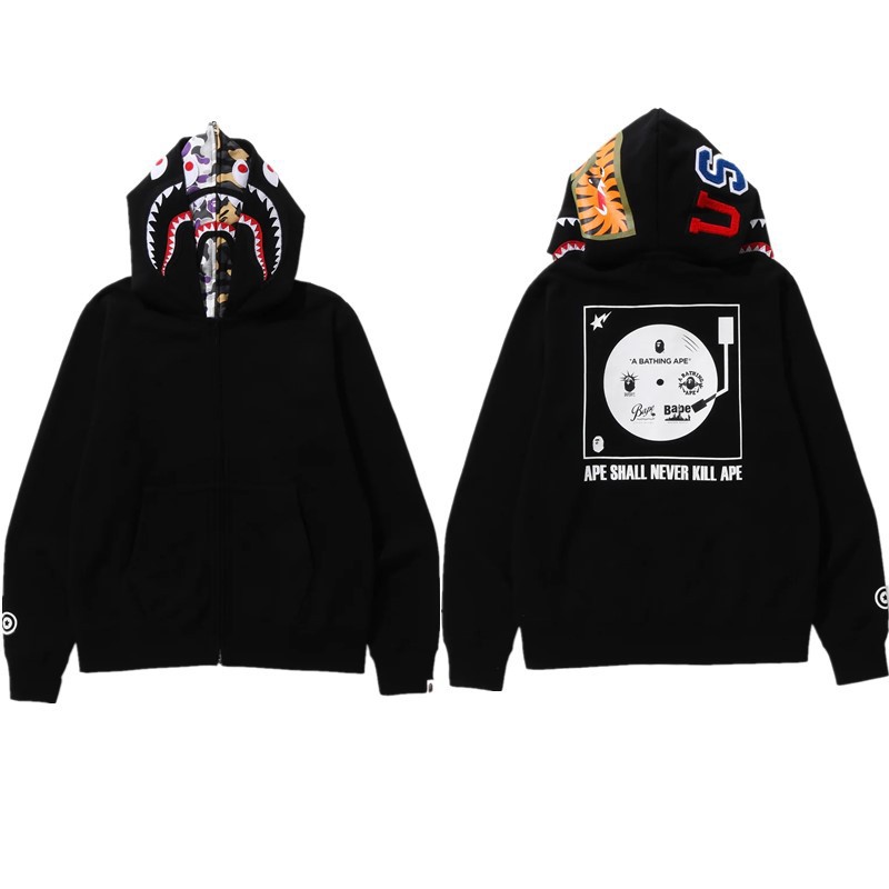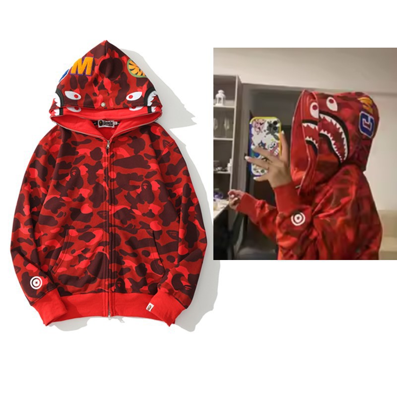 猿人APE サメと虎の頭刺繍入り迷彩柄ダブルハットスウェットシャツ メンズ ゆったりカーディガン ジップアップフード付きジャケット 夜光