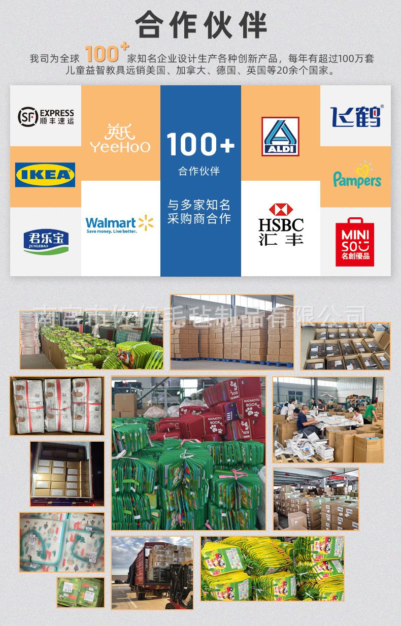 我们专注环保毛毡制品的创新研发与全球化供应,构建早教益智、生活护理、家居收纳三大产品矩阵,涵盖毛毡早教板、安静书、桑拿帽、创意收纳盒等千余款产品。依托年开发新品超1000款的资深设计团队和多项实用新型专利,采用"全球布局+本地化服务"模式,已为50余国教育机构、母婴品牌及零售商提供定制服务,客户复购率连续三年超85%。作为跨境毛毡制品核心供应商,公司持续拓展产业生态链,致力于以环保温暖的创新产品服务全球家庭。