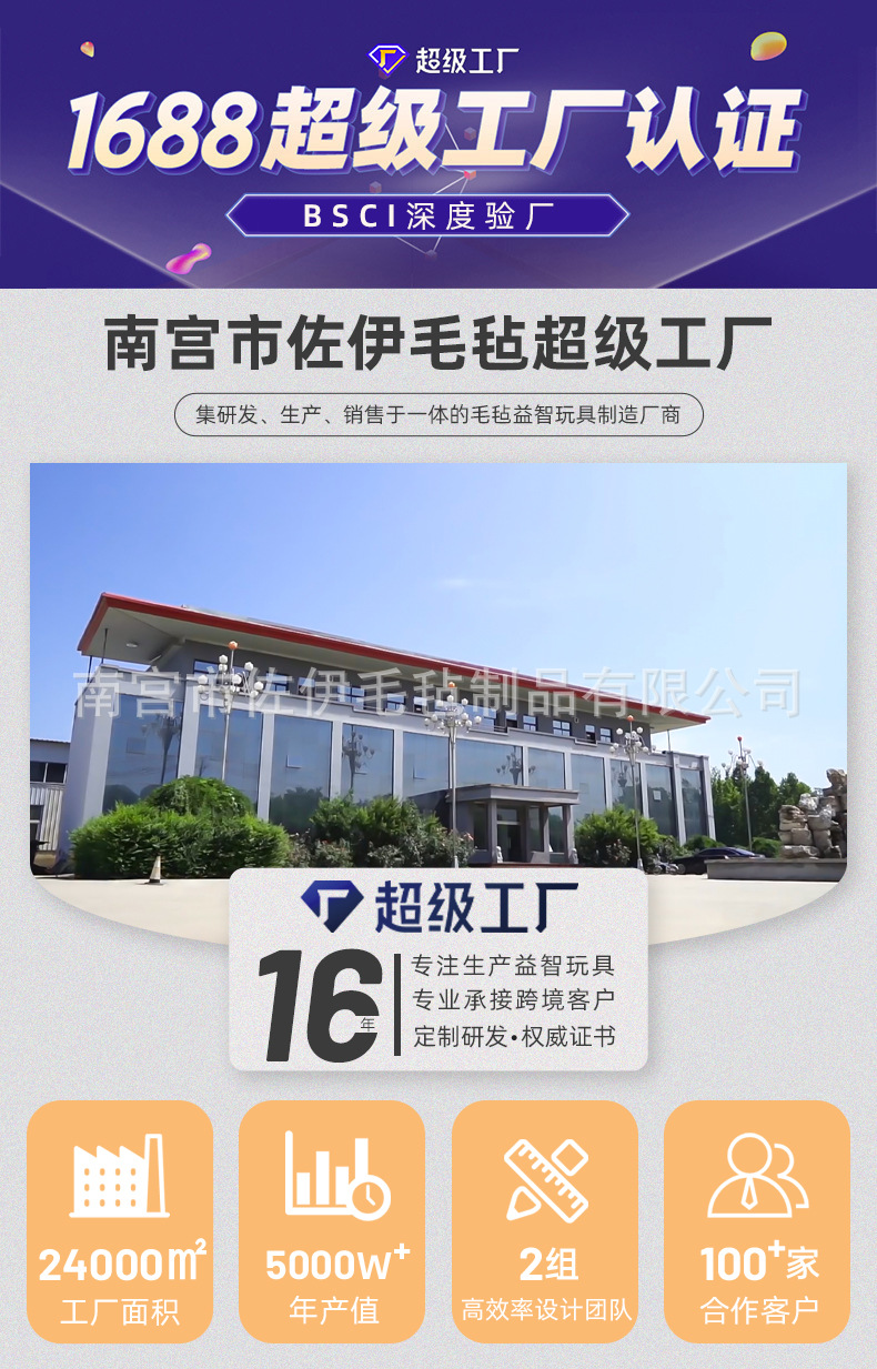 南宫市佐伊毛毡制品有限公司成立于2011年,是一家集研发设计、智能制造与跨境供应于一体的现代化毛毡制品工贸企业。公司拥有24000㎡生产基地,配备5条独立的生产线及模切机、激光切割机、热升华打印机等百余台先进设备,150余名专业技术人员覆盖生产、质检及产品开发全流程,已通过IS09001、BSCI、CP65、CPSC、EN71、ROHS、OEKO-TEX等国际权威认证。