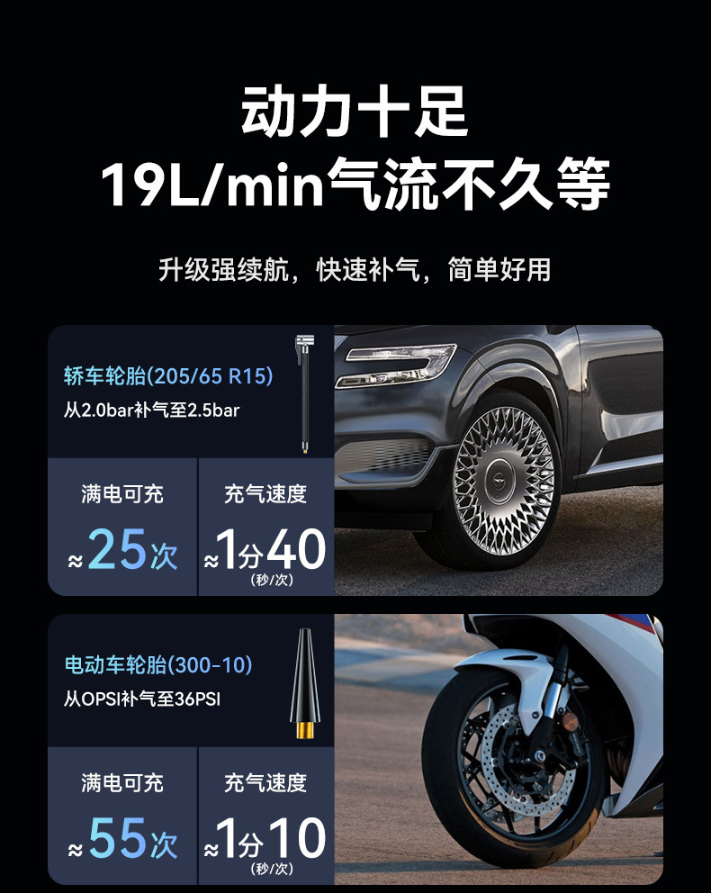 【时间】:锂电池满电工作时间:约20min 满电可打2条轮胎195/65R15 0~30 psi 充气时间:7-8min