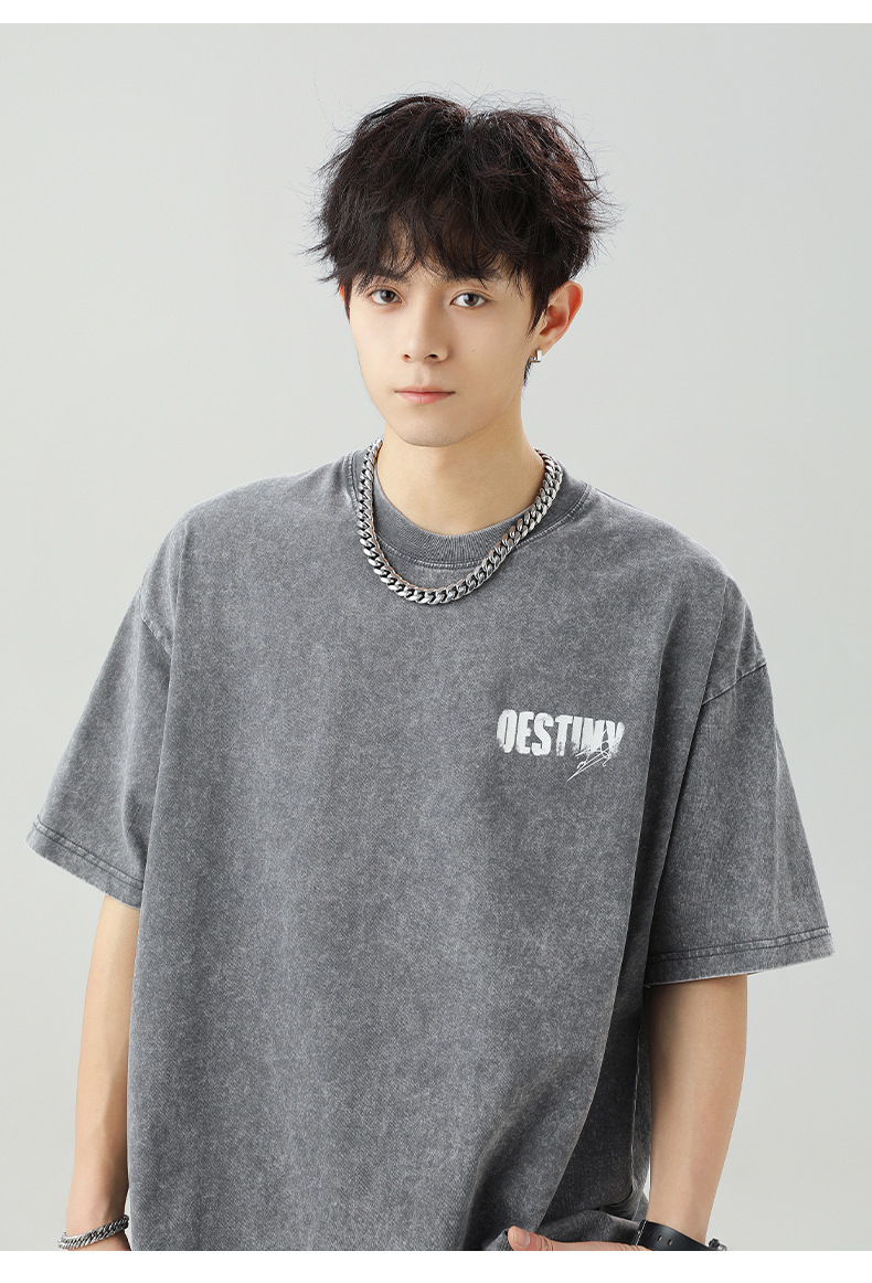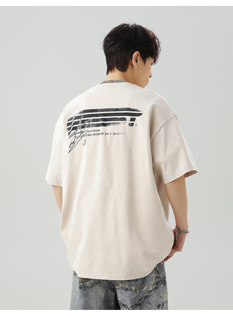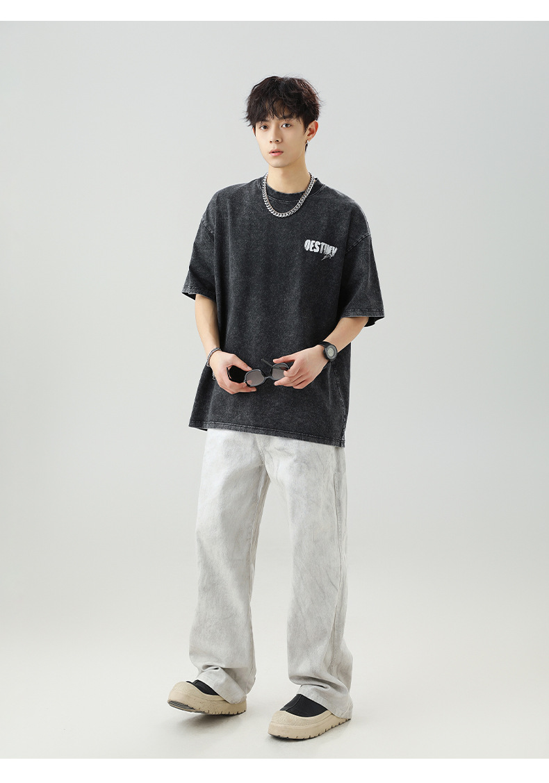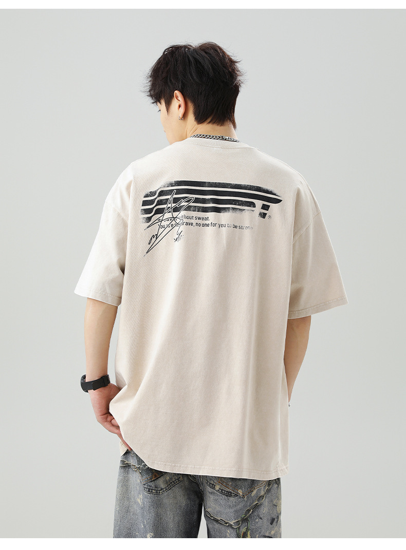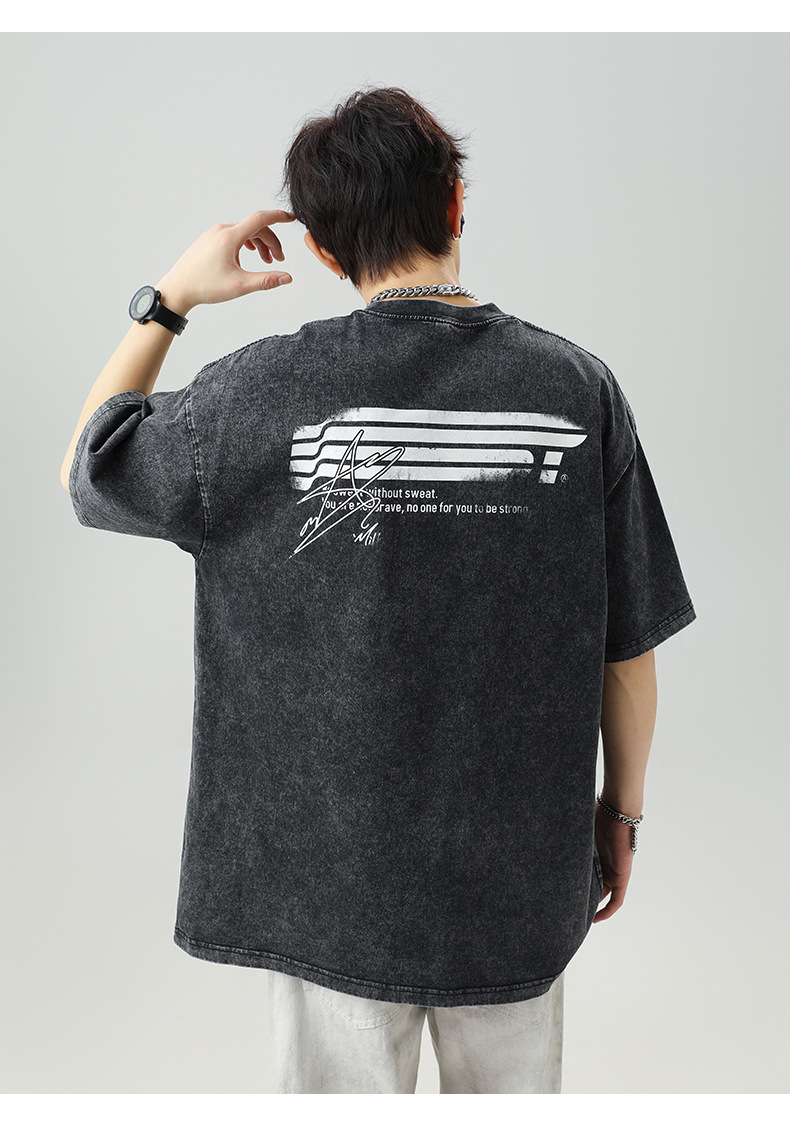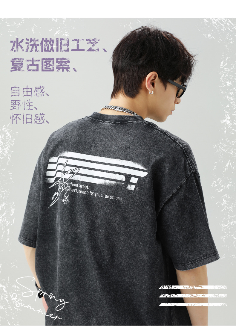 スノーフレークウォッシュ半袖Tシャツメンズ夏新作ブロークンテクスチャレタープリント半袖日本製ルーズTシャツq