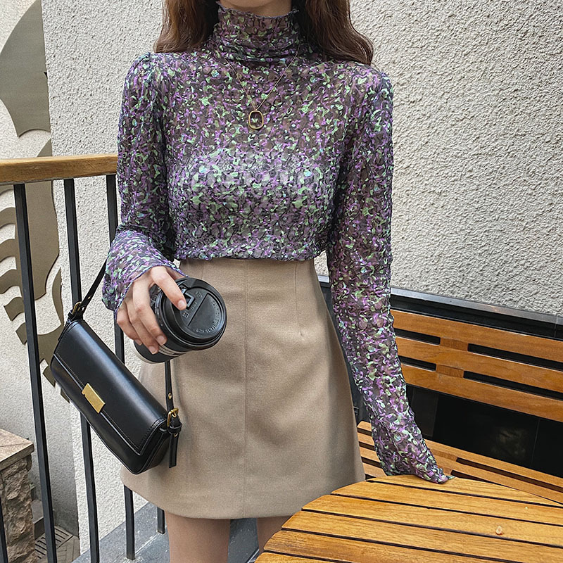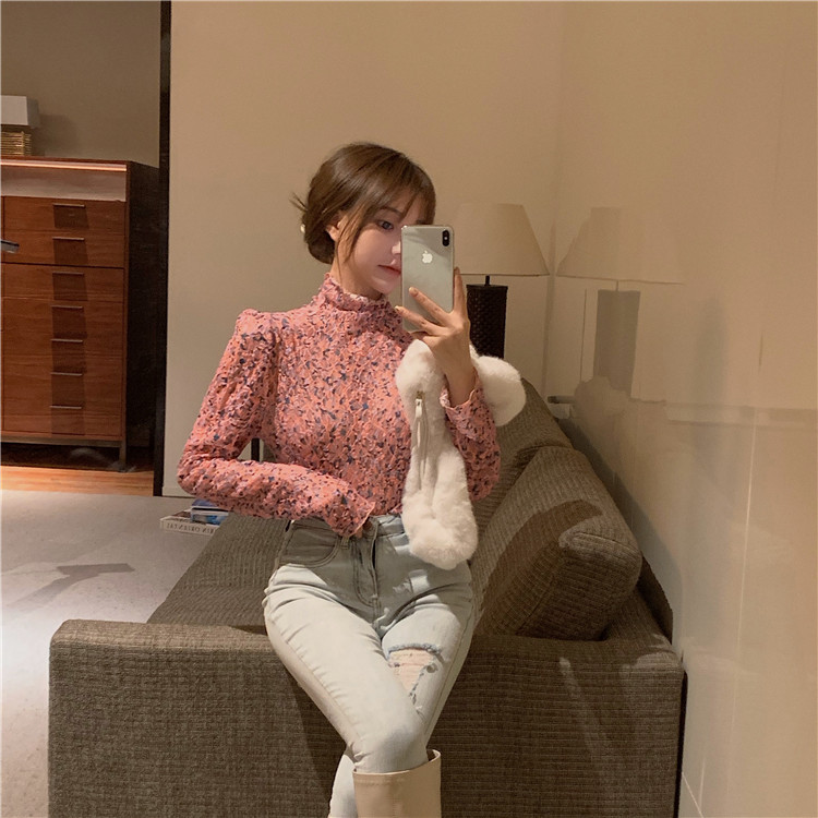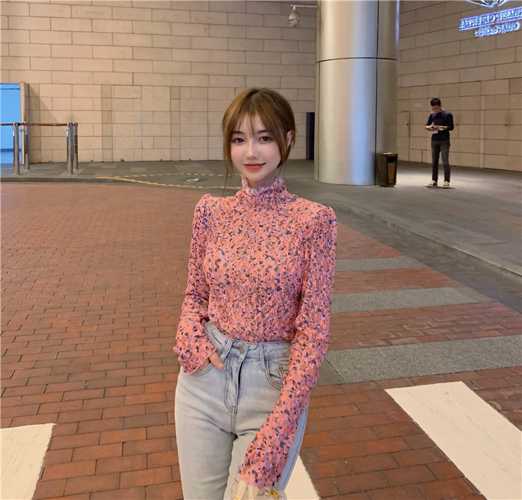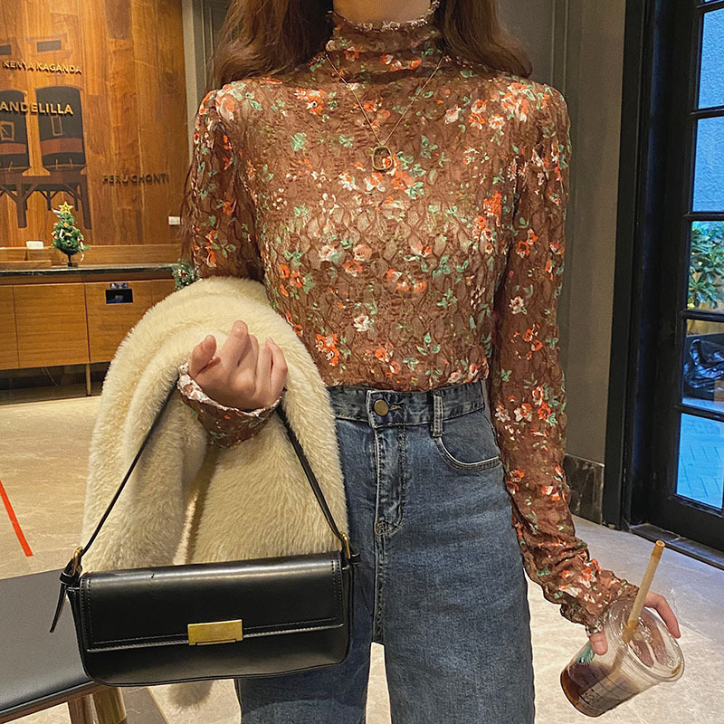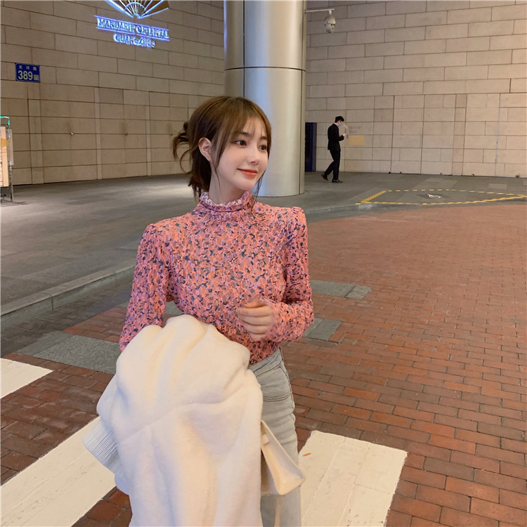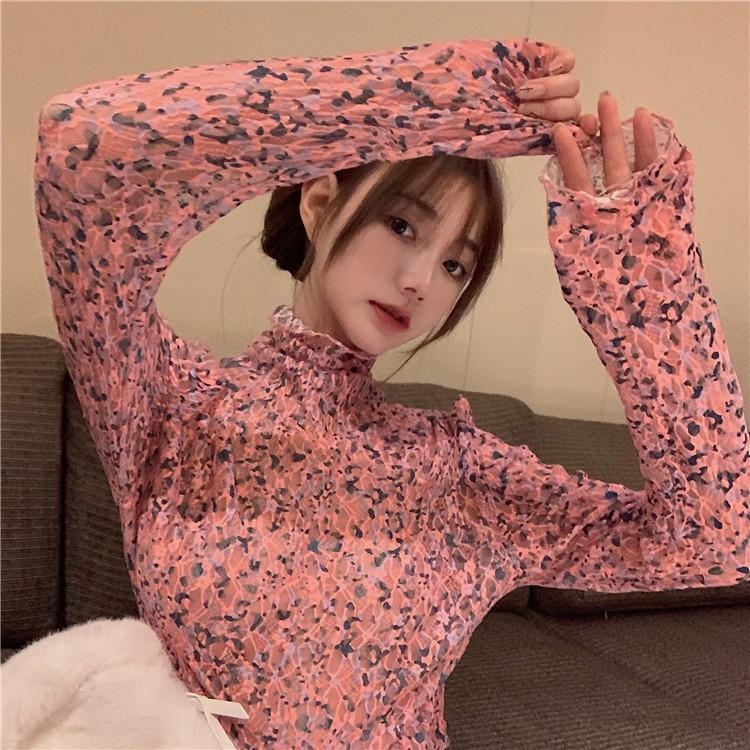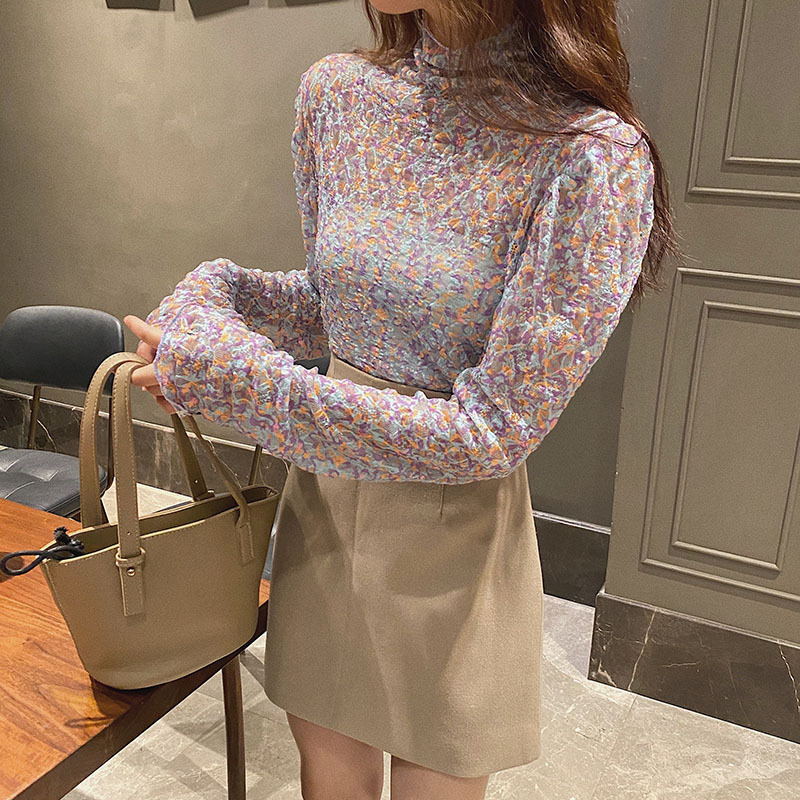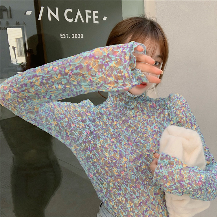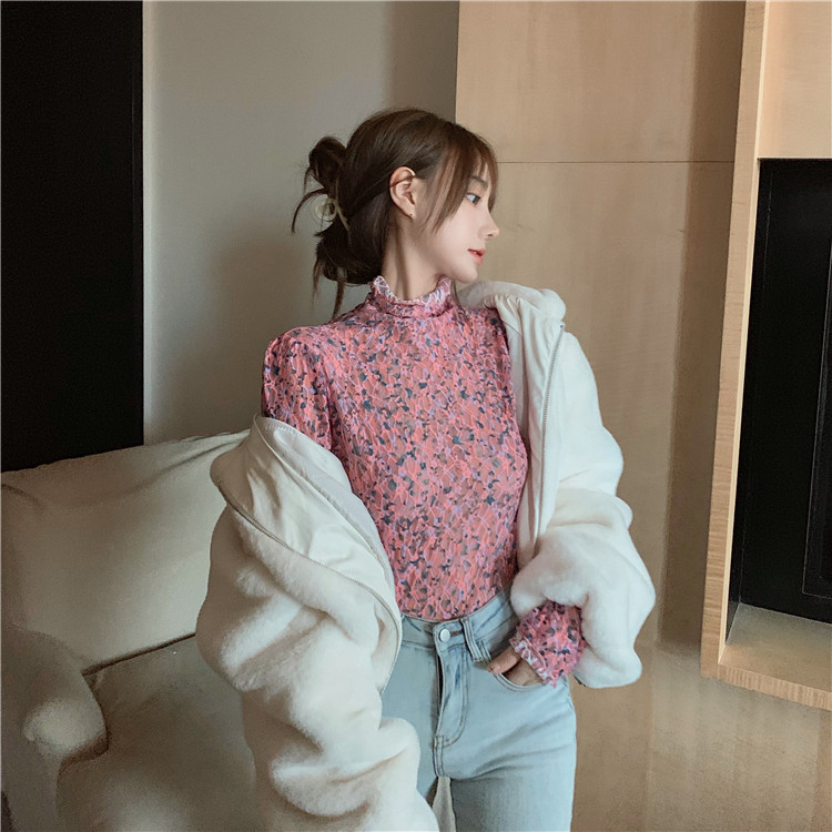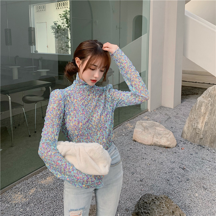 砕花百合底シャツ上着女子秋冬長袖修身高襟内に新型2025年tシャツinsブーム