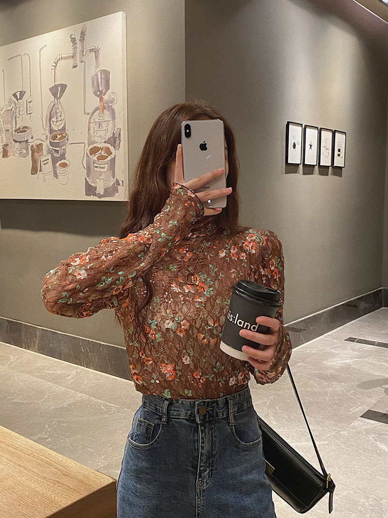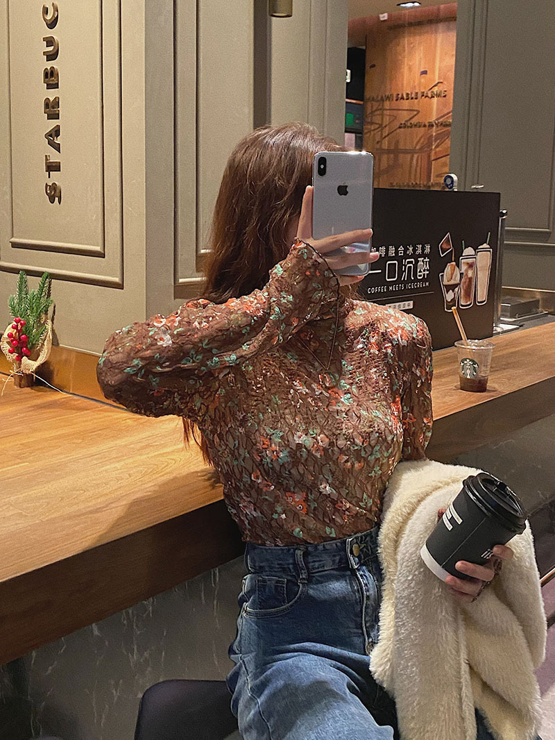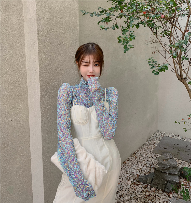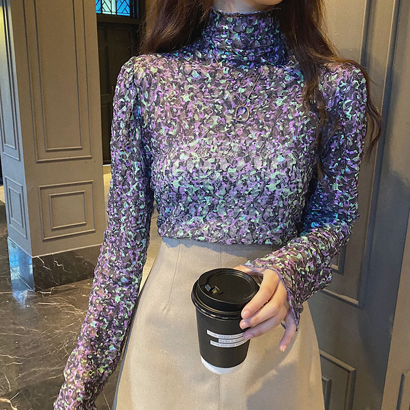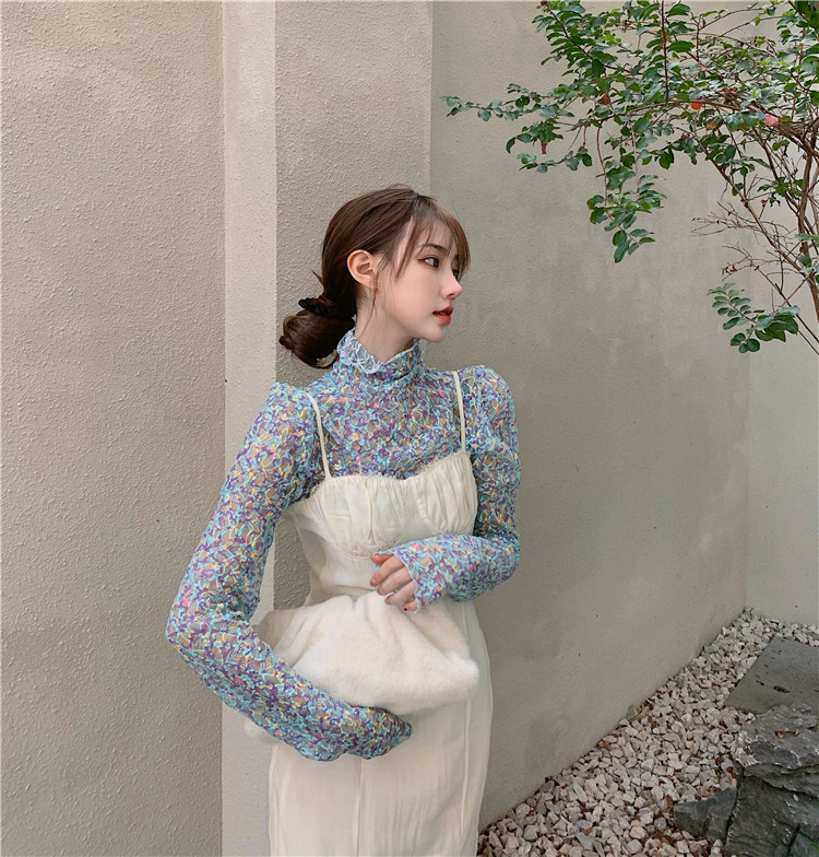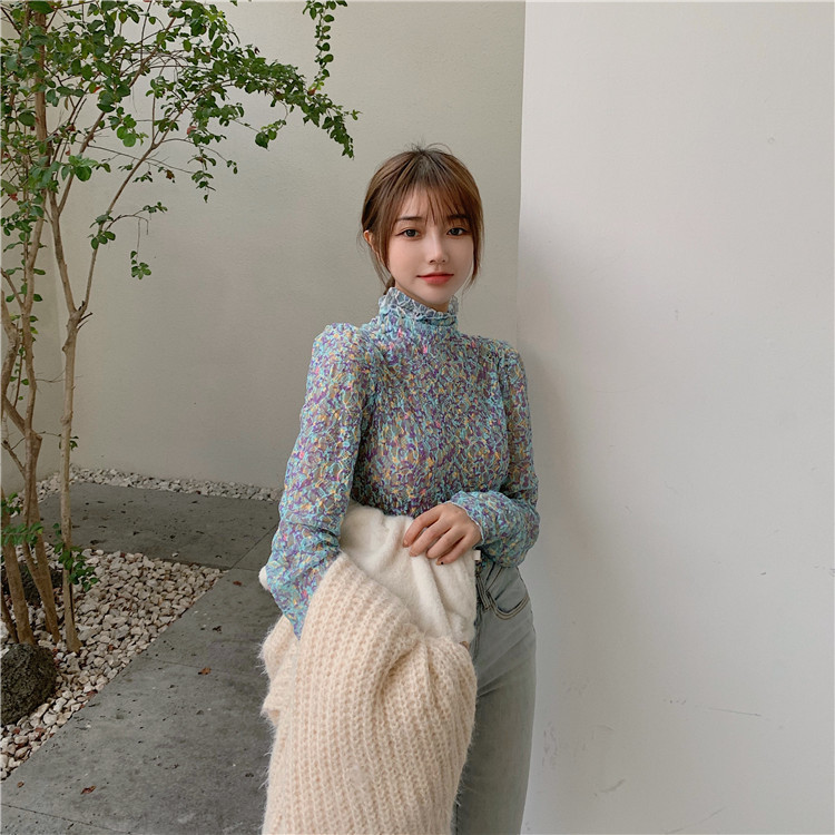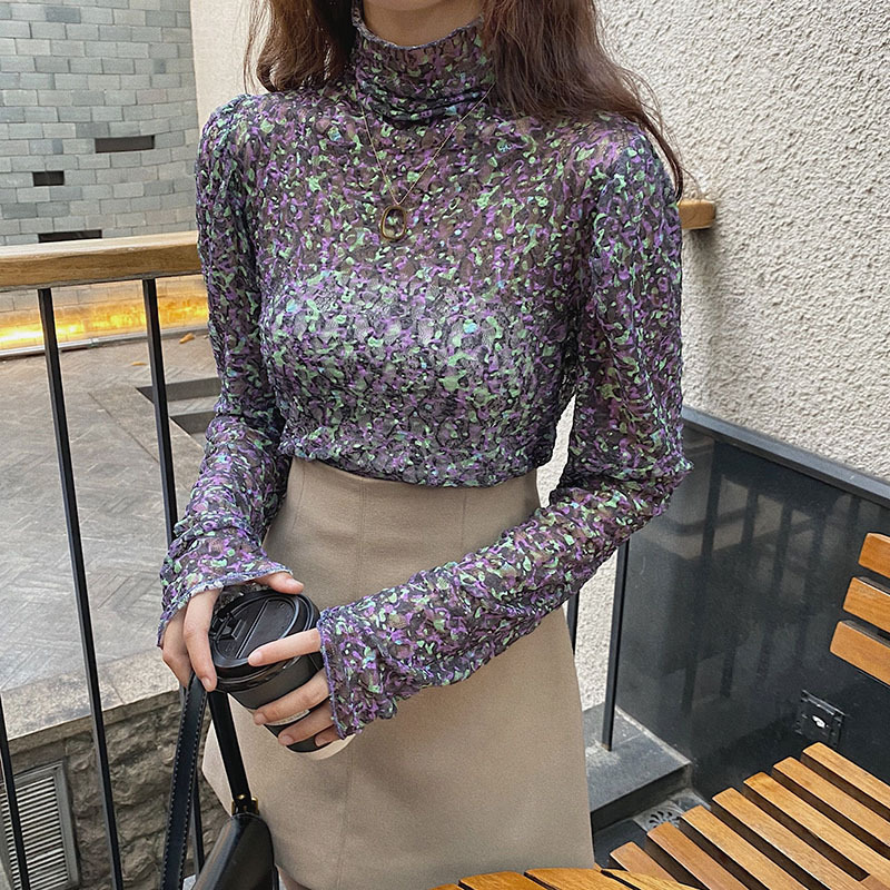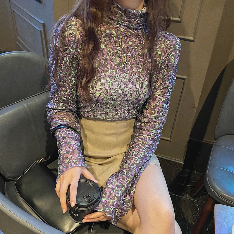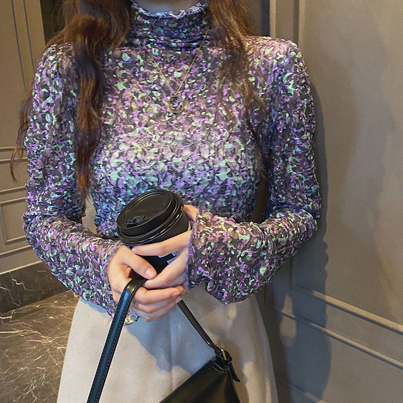 砕花百合底シャツ上着女子秋冬長袖修身高襟内に新型2025年tシャツinsブーム