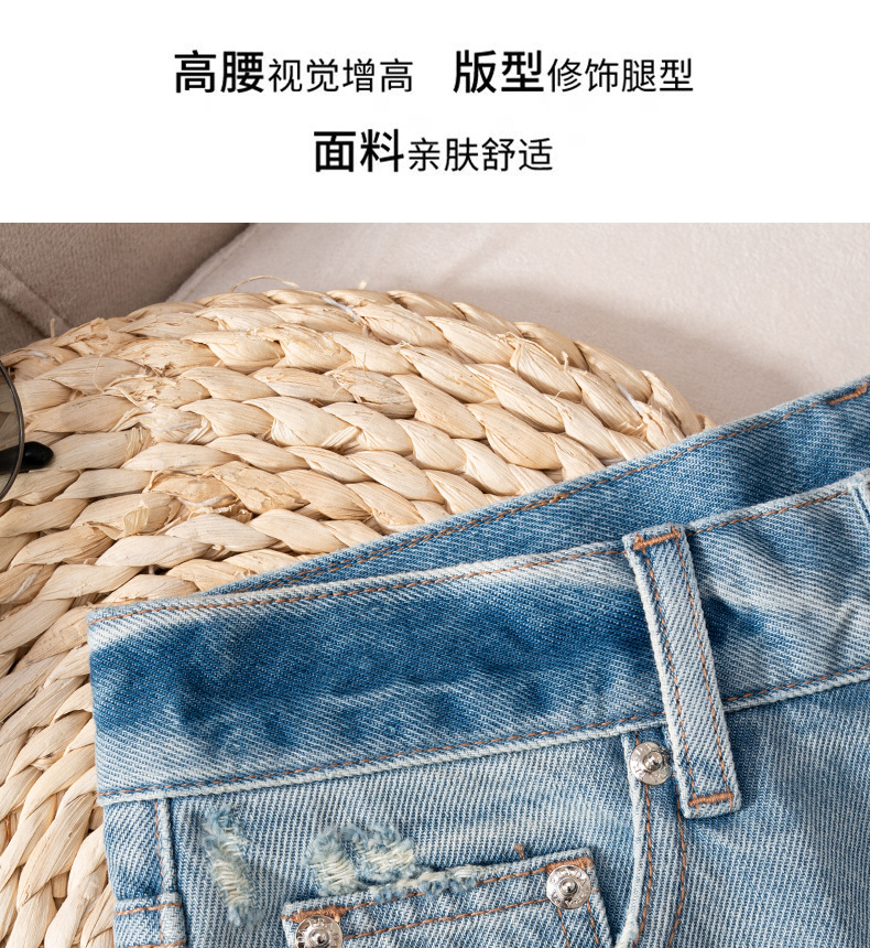 いいタイプですね水色のバリに穴が開いているデニムの半ズボンはやせていて足が長いです。2025夏の新型レジャー752