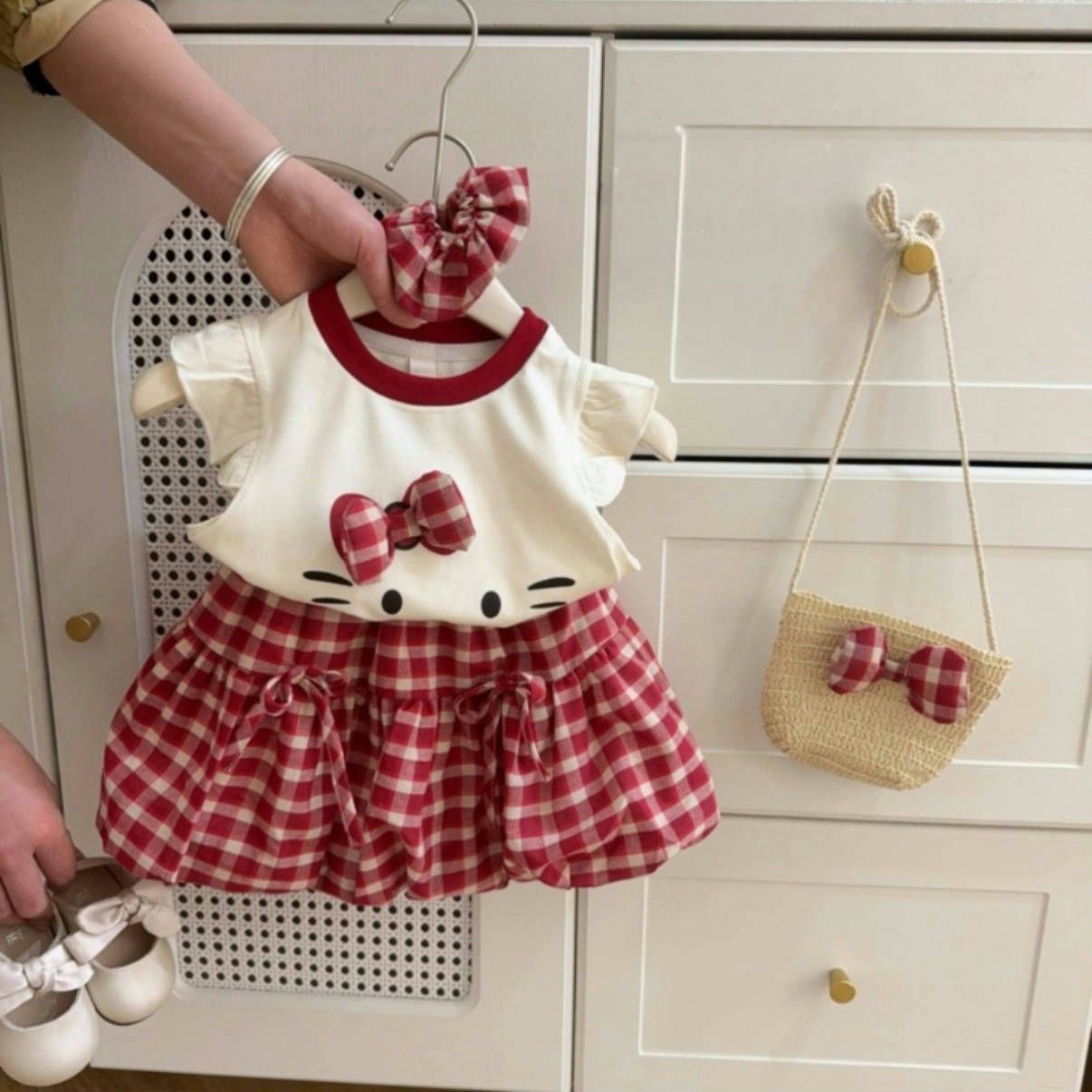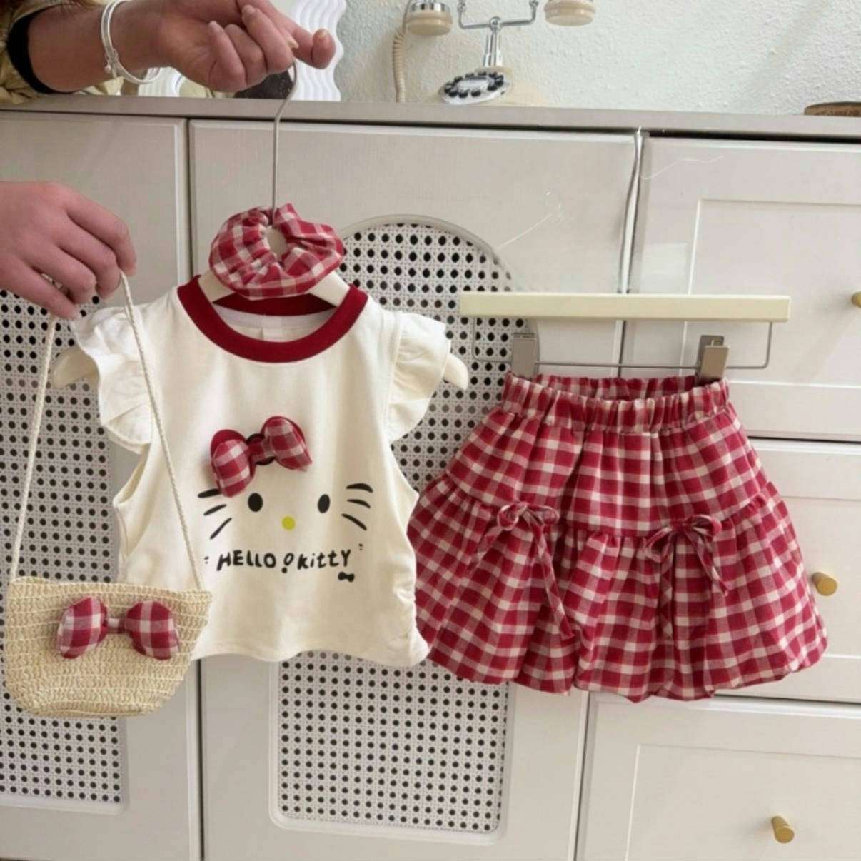 女の子の夏のスーツ2025の新型の洋気の子供のかわいい漫画のプリントの半袖のtシャツの格子のつぼみのスカート