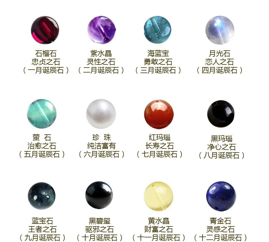 1月のザクロ,2月のアメジスト,マーチの海の青,4月は透明,メイジェイド,ジューンライラック,7月のルビー,オーガストグリーン,9月のサファイア,10月のローズストーン,11月のイエロートパーズ,12月 ブルートパーズ