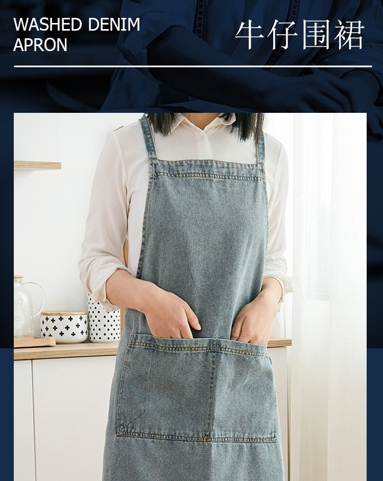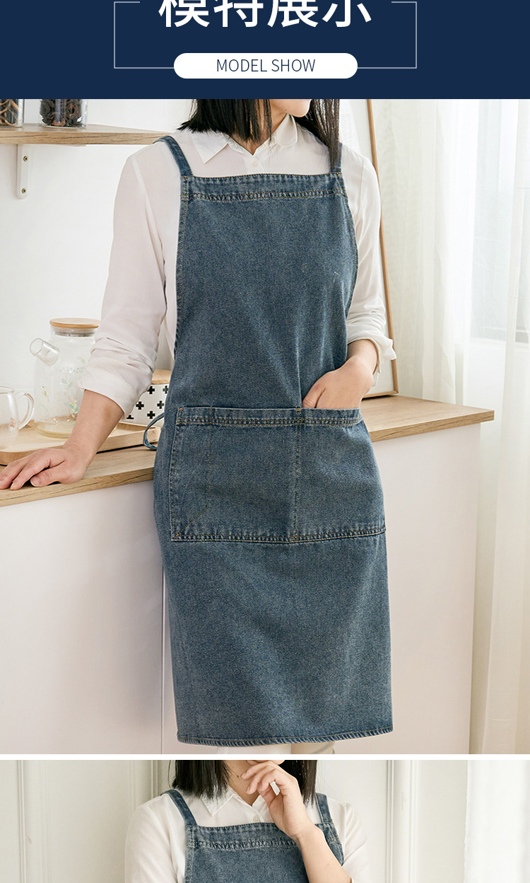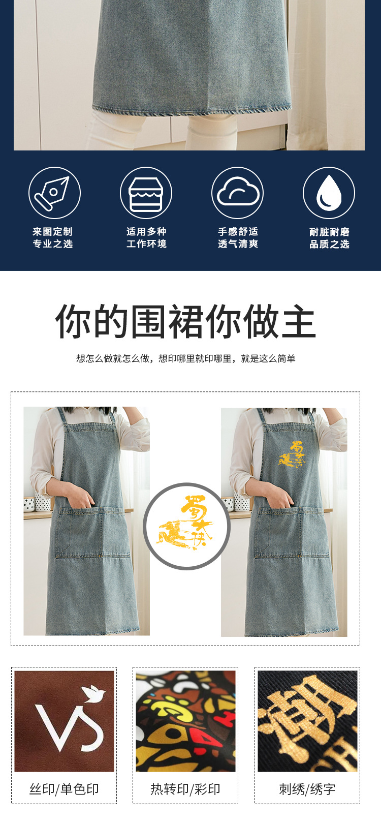 デニムのエプロンの台所の家庭用和式の工装のネイルの絵のコーヒーメーカーの仕事の男女は腰のロゴを囲んで印字します。