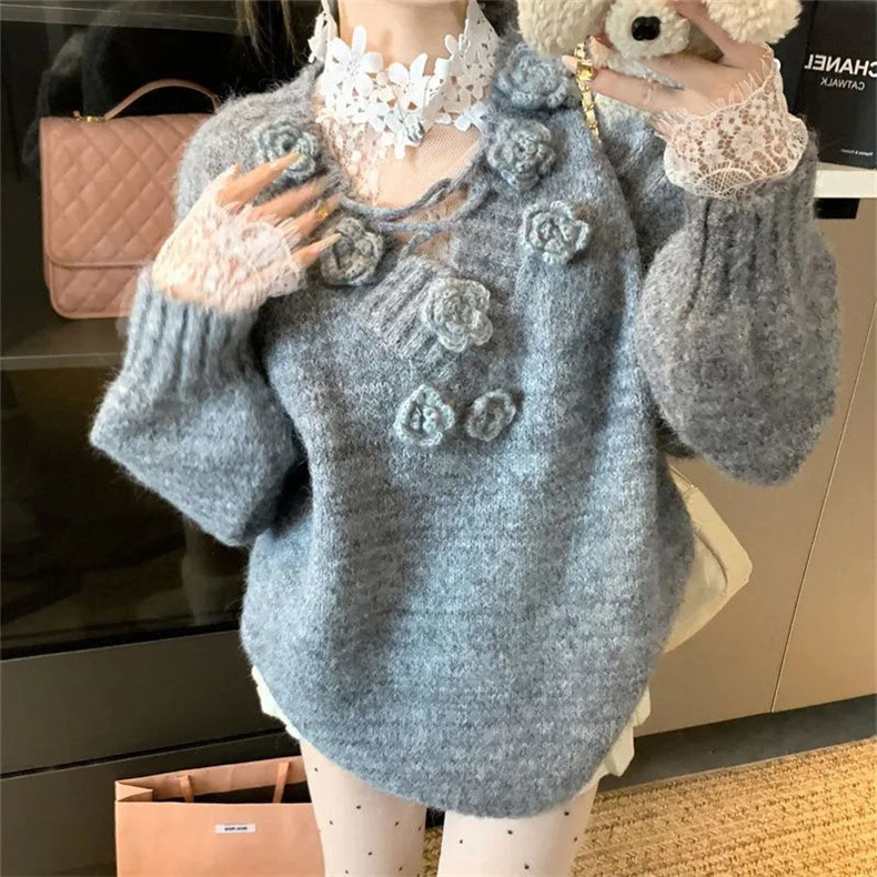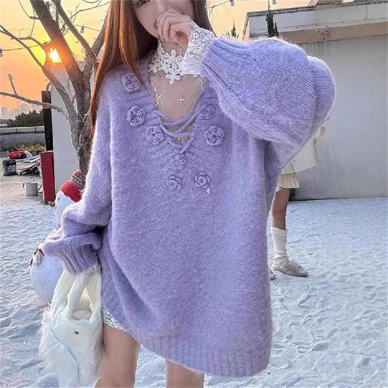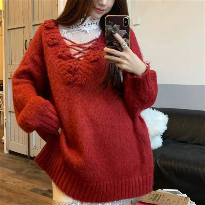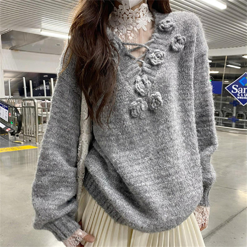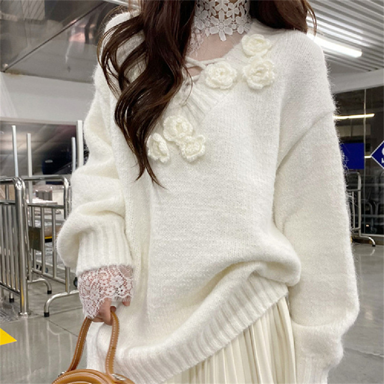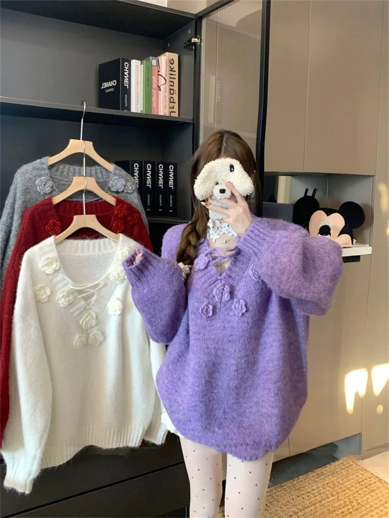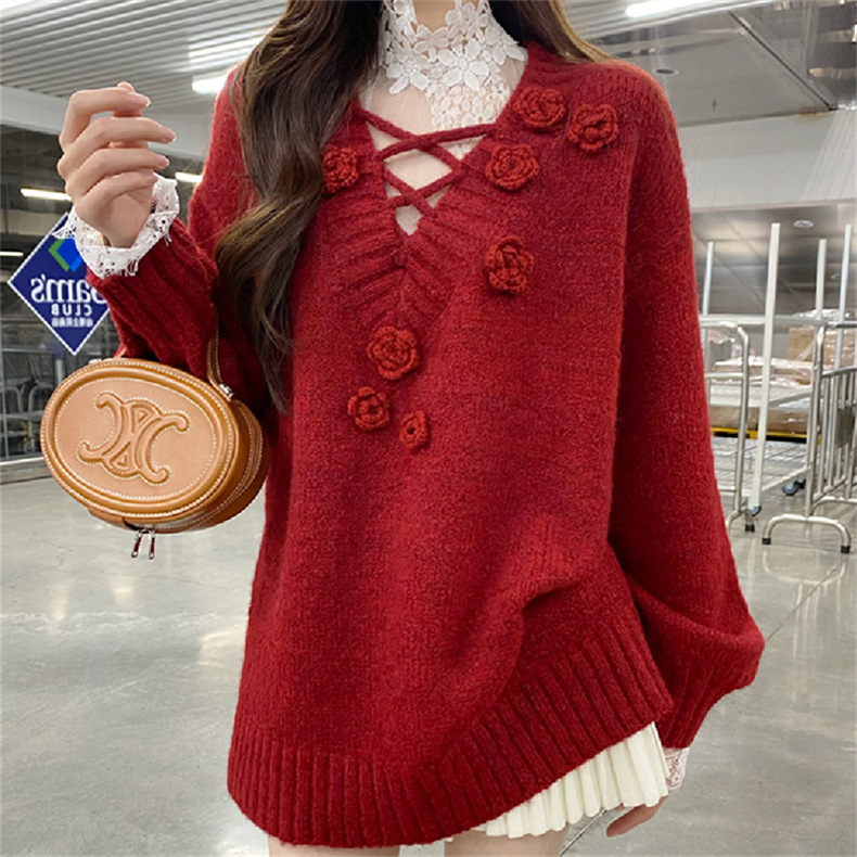 優しくスリムな立体花柄Vネックゆったり長袖セーター2025秋冬新作ニット柔らかトップス