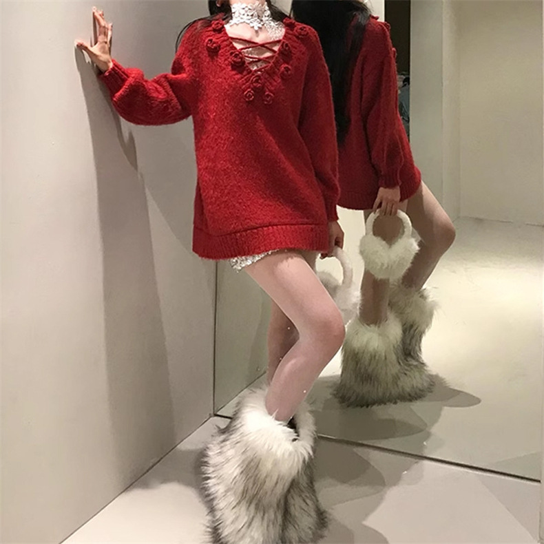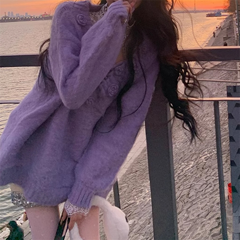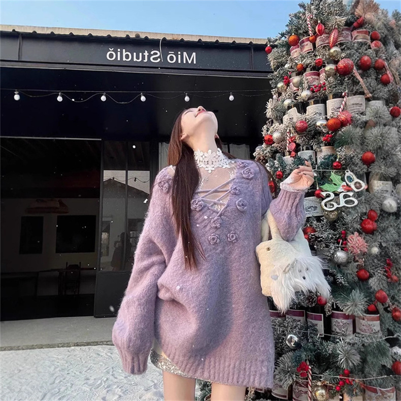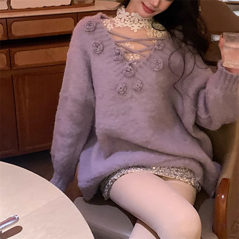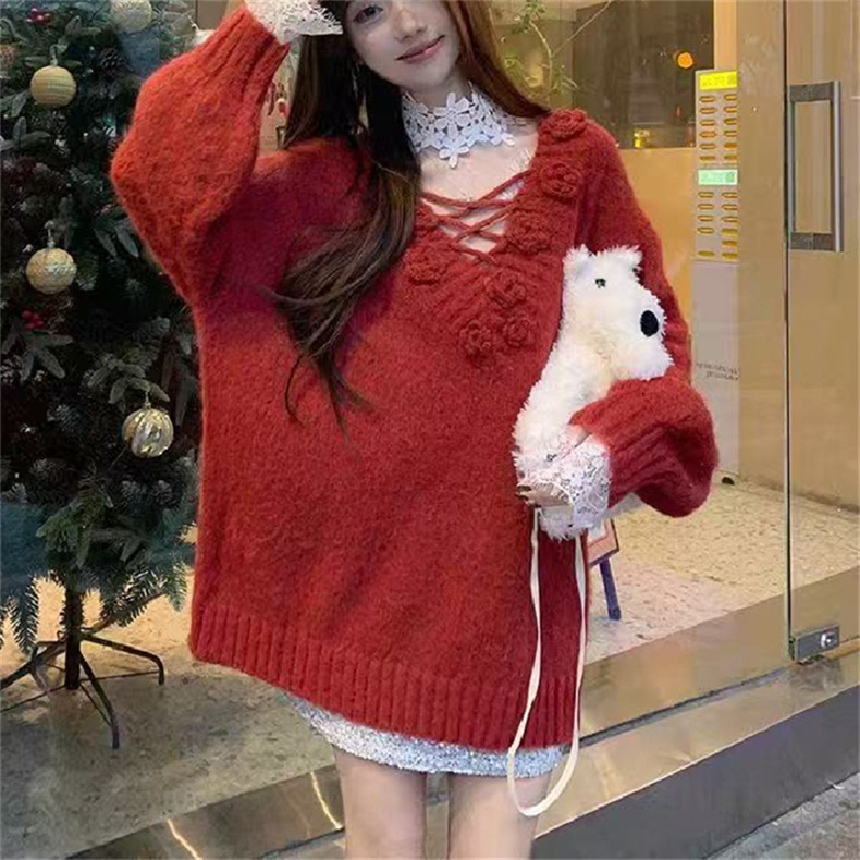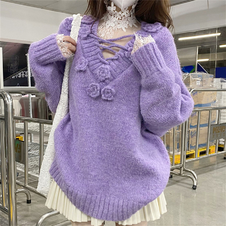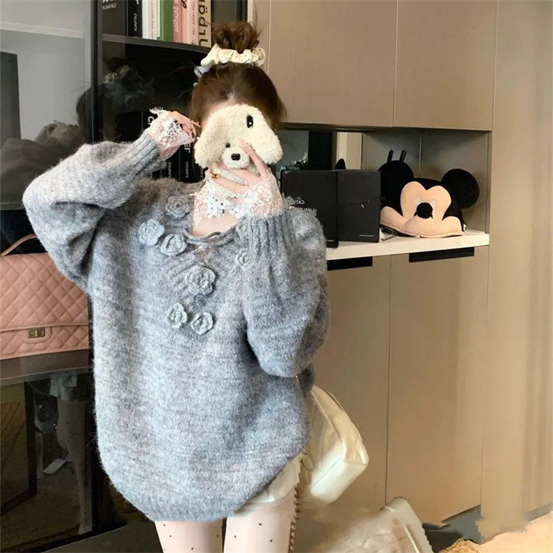 優しくスリムな立体花柄Vネックゆったり長袖セーター2025秋冬新作ニット柔らかトップス